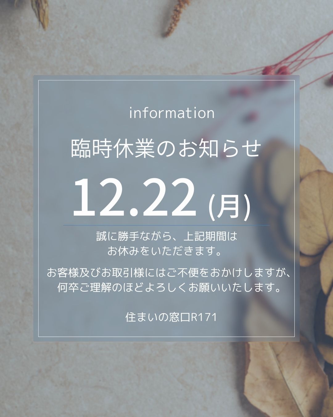 | 誠に勝手ながら、社内研修の為、12月22日(月)を臨時休業とさせていただきます。...more→ |